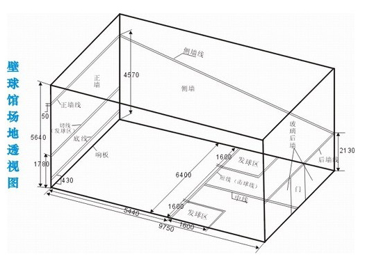 寬6.4米,長9.75米,前高4.57米,后高2.13米,天花高度5~6米,響板高度0.48米,正面發球線高度1.83米,地面發球線距后墻4.26米,半場線將地面發球線與后墻從中心向左右平分,發球區為1.6米見方。